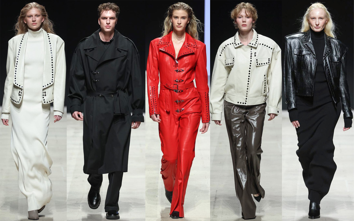 NO APOLOGIES’te; güçlü omuzlar, yapılandırılmış formlar ve ikinci ten hissi veren deri silüetlerle dikkat çekiyor. Metal detaylar, zımbalar ve troklar savunma değil; karakter ve imza niteliği taşıyor. Yoğun el işçiliği ve parlak yüzeyler, rock’n’roll ruhunu couture disiplinle bir araya getiriyor.